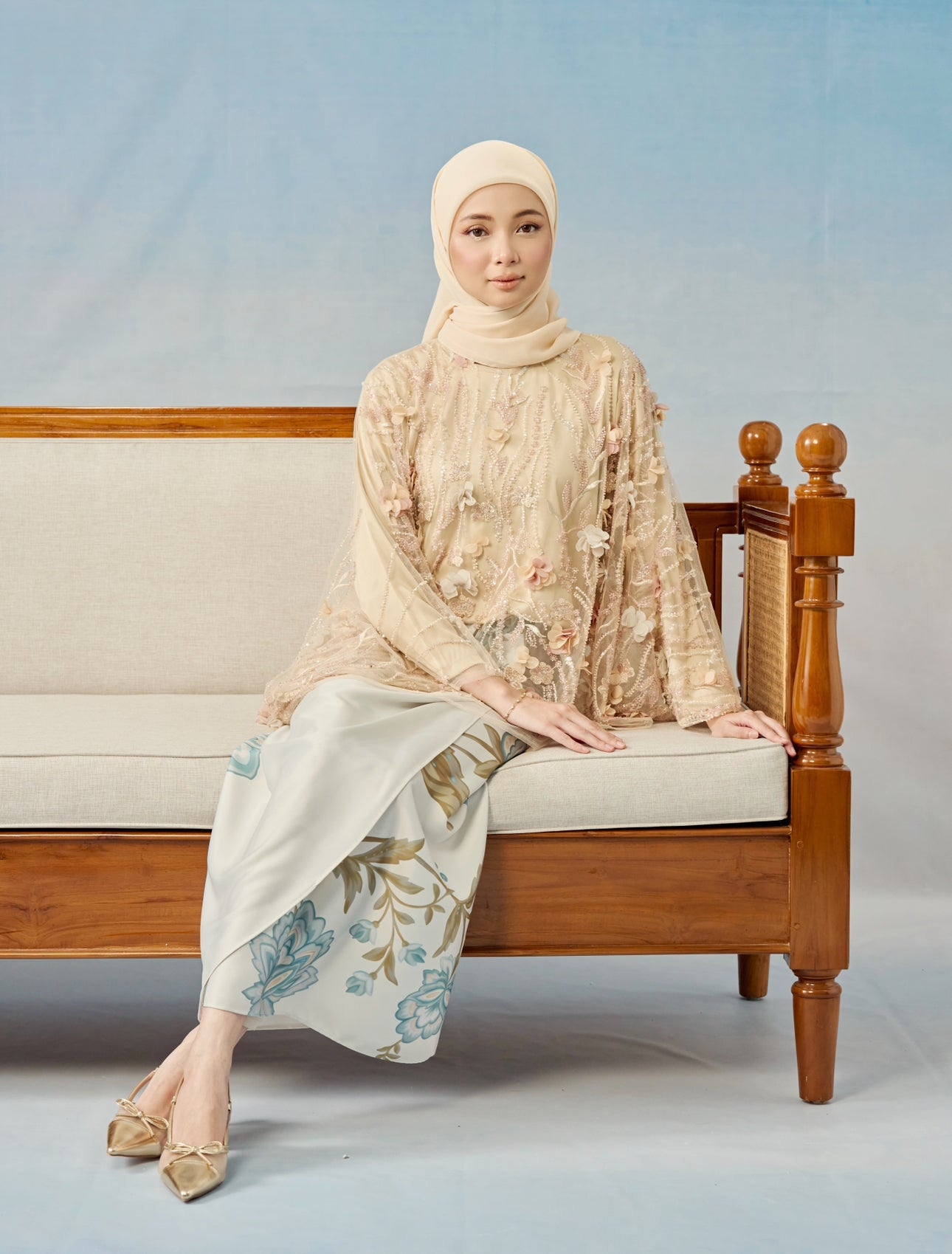 Dihasilkan daripada lace penuh dengan sulaman manik, Thea Caftan dihiasi dengan kelopak bunga 3D yang dijahit satu persatu, memberikan tekstur yang halus serta sentuhan eksklusif yang menyerlah secara semula jadi. Setiap butiran memantulkan cahaya dengan lembut, mencipta aura mewah tanpa berlebihan.